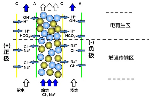 EDI電流密度的增加以及淡水室中樹脂表面水解離不斷產(chǎn)生的氫離子和氫氧根離子,可使淡水室的局部pH值發(fā)生變化,在特定的地方產(chǎn)生高pH區(qū)和低pH區(qū)。這些極端pH值區(qū)被認(rèn)為是在EDI模塊內(nèi)部創(chuàng)造了一個(gè)特定的有利于抑制細(xì)菌的快速繁殖的環(huán)境,尤其是在產(chǎn)水側(cè),他們是非常關(guān)鍵的。 同時(shí),由于陰離子交換樹脂表面帶正電荷,而細(xì)菌(尤其是對(duì)制藥用水影響較大的革蘭陰性菌)帶負(fù)電荷,使其易被吸附到陰離子交換樹脂表面,處于水解離最活躍的部位。從而使其生長受到抑制甚至被殺滅,大大減輕了EDI產(chǎn)水受細(xì)菌內(nèi)毒素污染的程度。