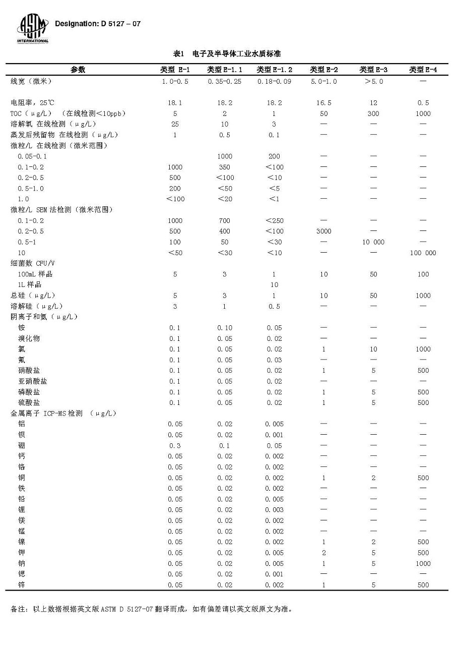 在電子工業(yè)的生產(chǎn)工藝中,相當(dāng)多的工序要進(jìn)行化學(xué)處理,而電子產(chǎn)品的清洗和化學(xué)藥劑的制備都直接或間接地要利用到純水或超純水。隨著電子工業(yè)的發(fā)展,尤其是以超大規(guī)模集成電路為代表的半導(dǎo)體產(chǎn)業(yè)的發(fā)展,對(duì)純水的水質(zhì)提出了更高的要求,下表所列為美國(guó)材料測(cè)試協(xié)會(huì)(ASTM)根據(jù)半導(dǎo)體特性而制定的超純水水質(zhì)要求。