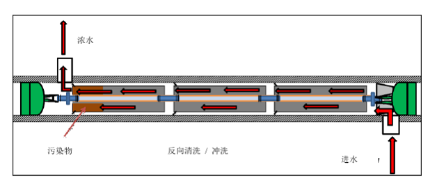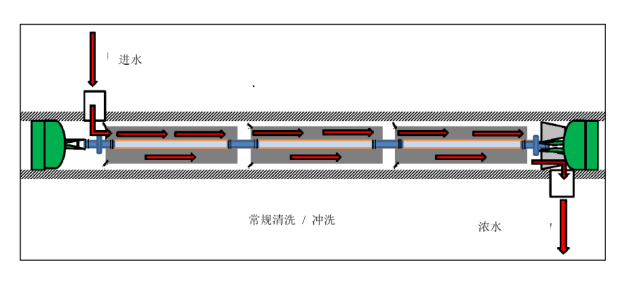 常見的反滲透的沖洗設計一般是從壓力容器進水端流入,經過膜元件后從壓力容器濃水端流出,這個流向與反滲透系統正常運行時是一樣的。反滲透的反向沖洗指的是由濃水端向進水端方向進行沖洗的過程, 反向沖洗有助于去除反滲透系統的前端污染物,采用此方法進行沖洗反滲透膜元件受到的污染更??;當有顆粒物(細砂、活性炭)時,必須采用此方法,以免反滲透膜表面被劃傷。需要注意的是任何時候嚴禁由產水端向進水端進行沖洗,這會造成反滲透膜元件背壓,使反滲透膜元件受到不可逆轉的損害。