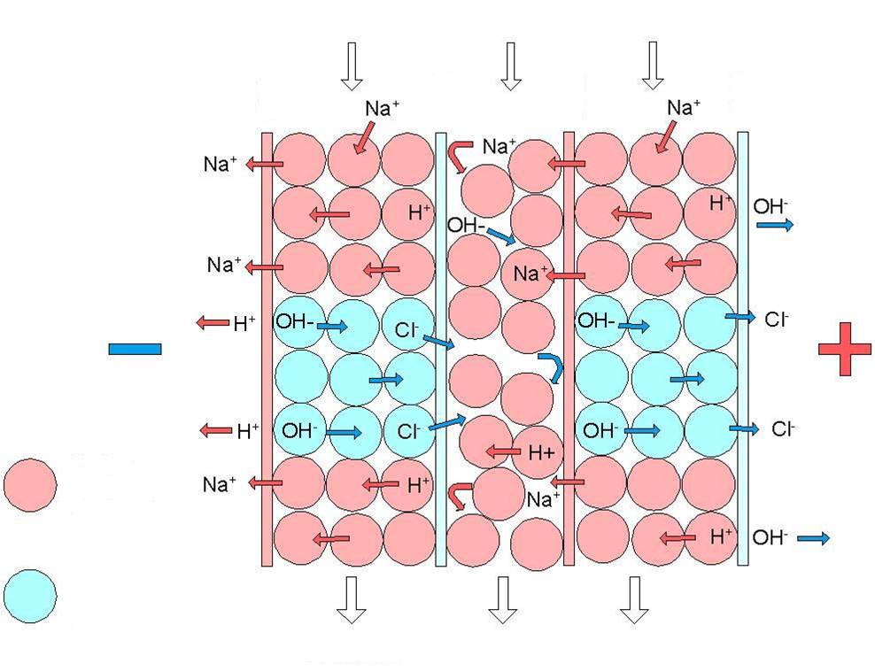 ● 模塊兩端的電極提供了橫向的直流電場(chǎng),電流驅(qū)動(dòng)水中的陽(yáng)離子(如鈉離子Na+)透過(guò)陽(yáng)離子膜,反之陰離子(如氯離子Cl-)透過(guò)陰離子膜,并防止陰陽(yáng)離子由另一側(cè)濃水室進(jìn)入淡水室(陰離子不能透過(guò)陽(yáng)離子膜,陽(yáng)離子不能透過(guò)陰離子膜),水從離子膜表面流過(guò)而不能透過(guò)離子膜。陰陽(yáng)離子從淡水室遷移到濃水室。在此過(guò)程可以去除大多數(shù)的強(qiáng)電解質(zhì)物質(zhì),離子交換樹脂起到簡(jiǎn)單的導(dǎo)體作用。
