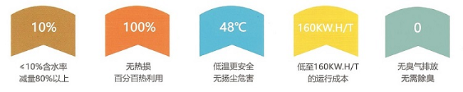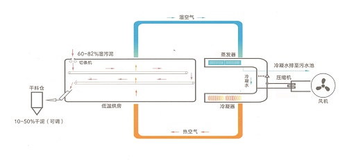 低溫污泥干化是利用除濕熱泵對污泥采用熱風循環冷凝除濕烘干,除濕熱泵烘干是利用制冷系統使來自干燥室的濕空氣降溫脫濕同時通過熱泵原理回收水分凝結潛熱加熱空氣達到干燥物料目的。除濕熱泵是除濕(去濕干燥)加熱泵(能量回收)結合,是干燥過程中能量循環利用,除濕干化過程基本沒有廢熱排放。