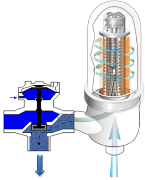 當盤式過濾器疊片之間的溝紋累積大量雜質后,進出口壓差達設定值時(高報警),三通閥門改變過濾單元中水的流向,盤片被頂開,過濾過程中的小孔隙被打開。位于疊片中央的噴嘴沿切線噴水,使疊片旋轉,在水流的沖洗與疊片高速旋轉下,截留在疊片上的固體物被沖洗出去。然后活塞再次下壓疊片,回復過濾狀態(tài)。當反沖結束時,水流方向再次改變,疊片再次被壓緊,系統(tǒng)重新進入過濾狀態(tài)。